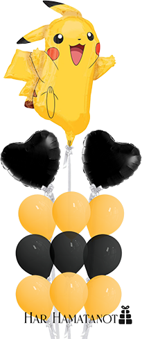 זר מהמם של פוקימון לילד המכיל בלון אלומיניום ענק של פיקאצ'ו 2 בלוני לב אלומיניום 18 אינץ' 9 בלוני גומי ניתן לשנות את צבעי הזר בהתאם לבקשתכם